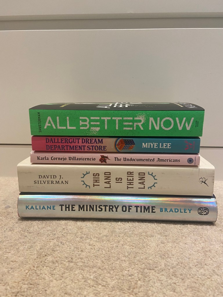 I got super lucky with my charity shop finds this month! Snagged a special edition of The Ministry of Time for just $3!! Also really excited to read the new Neal Shusterman, All Better Now, for book club in March 🙂